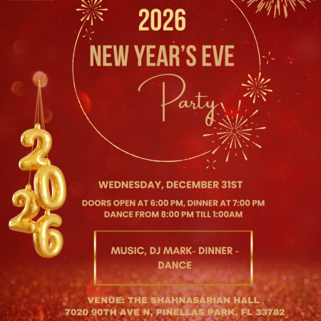 We invite you to join St. Hagop Armenian Church in the Shahnasarian Hall for a New Year’s Eve celebration! Click here to make online ticket purchase . You may also pre-pay by check made out to St. Hagop, memo: ‘New Years’. Please contact Lusine Sahakyan at events@sthagopfl.org with questions. Where: Shahnasarian Hall 7020 90th Ave, Pinellas Park, FL 33782 When: Wednesday December 31, 2025 …