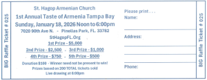 Taste of Armenia Raffle Tickets $100.00 To submit donations online securely and easily with any credit card, just enter your desired donation amount, click “add to cart” then “view cart” to enter info and checkout. Taste of Armenia Raffle Tickets quantity Add to cart Category: Raffle Tickets Related products Key West Stay Raffle $10.00 Add to cart Tampa Bay Bucs vs. Arizona Cardinals Raffle $10.00 Add to cart