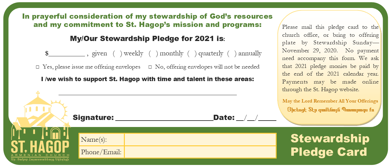 With our transition away from dues paid membership, St. Hagop relies totally on the stewardship of our parishioners to continue our mission and programs at St. Hagop Armenian Church.  We hope you will join the over 100 parishioners who have made a confidential pledge commitment to support St. Hagop regularly through their stewardship.  You may make payments on your 2021 pledge here with any credit card. Just enter the amount, click “add to cart,” then “view cart” to enter info and checkout. St. Hagop uses secure checkout to protect your information!